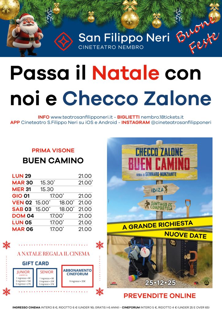Ecco i film che sono attualmente in programmazione: Buen camino Ecco i film che sono in programmazione per il cineforum: Nessun film attualmente in programmazione per il Cineforum.