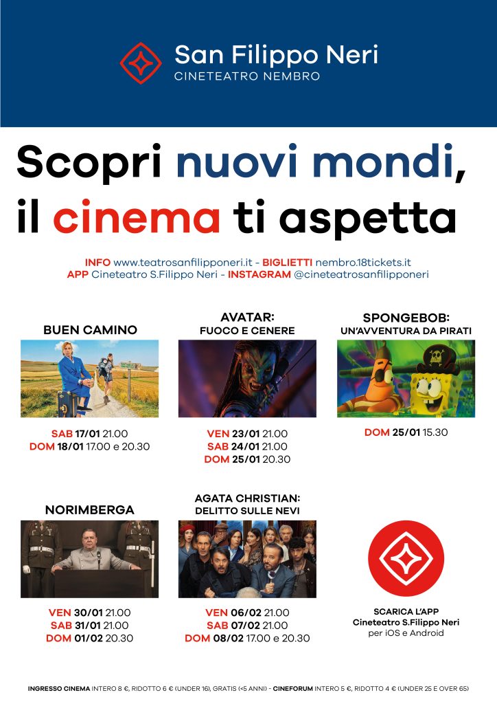 Ecco i film che sono attualmente in programmazione: Norimberga (nuremberg)Spongebob – un’avventura da piratiAvatar: fuoco e cenere (avatar: fire and ash)Buen camino Ecco i film che sono in programmazione per il cineforum: C’era una volta mia madreIl sentiero azzurroIl professore e il pinguinoUn semplice incidenteLe assaggiatriciLa voce di hind rajabTre ciotoleCinque secondi